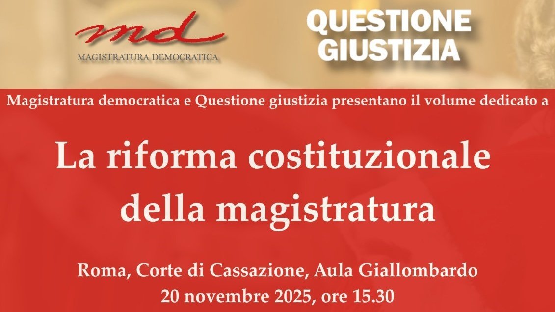 Magistratura democratica e Questione giustizia presentano il volume dedicato a La riforma costituzionale della magistratura, 20 novembre 2025, ore 15.30, Roma, Corte di Cassazione, Aula Giallombardo