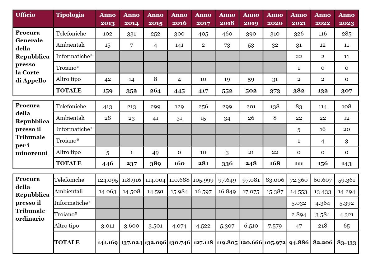 (*) L’ulteriore dettaglio per le intercettazioni “informatiche” e “trojan” è stato introdotto a partire dall’anno 2021.