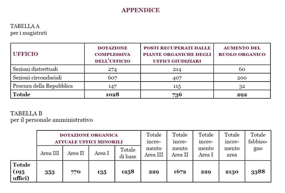 2. Pare opportuno riportare le conclusioni sintetiche dello studio del Dipartimento Organizzazione giudiziaria, pubblicato il 21 luglio 2022: Questioni inerenti ai maggiori fabbisogni di dotazione personale di magistratura e amministrativo nonché sui fabbisogni logistici – cfr. infra, in Appendice, le tabelle A e B.
